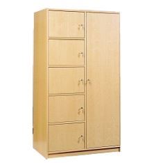 Dieser kombinierte Eigentums-/Kleiderschrank verfügt über 5 Schließfächer, Mittwelwand, 1 Tür, 1 Fachboden und 1 Kleiderstange.