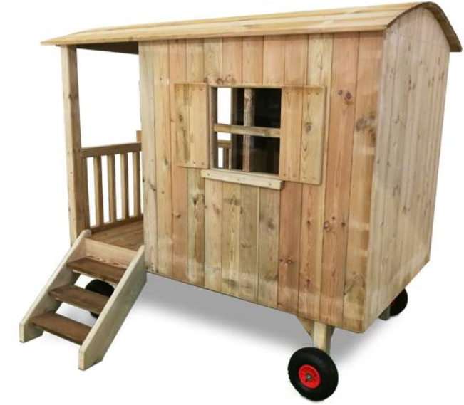 Die links oder rechts montierbare Treppe führt auf die Veranda und zum Spielbereich mit Sitzbank. Dank der zwei Fenster mit Plexiglasscheiben und fest verschraubten Fensterläden gibt es genug Licht und einen guten Ausblick. Der teilmontierte, nicht fahrbereite Wagen besteht komplett aus widerstandsfähigem kesseldruckimprägniertem Kiefernholz. Die Räder sind im Übrigen reine Dekoration, der Wagen ist nicht mobil.