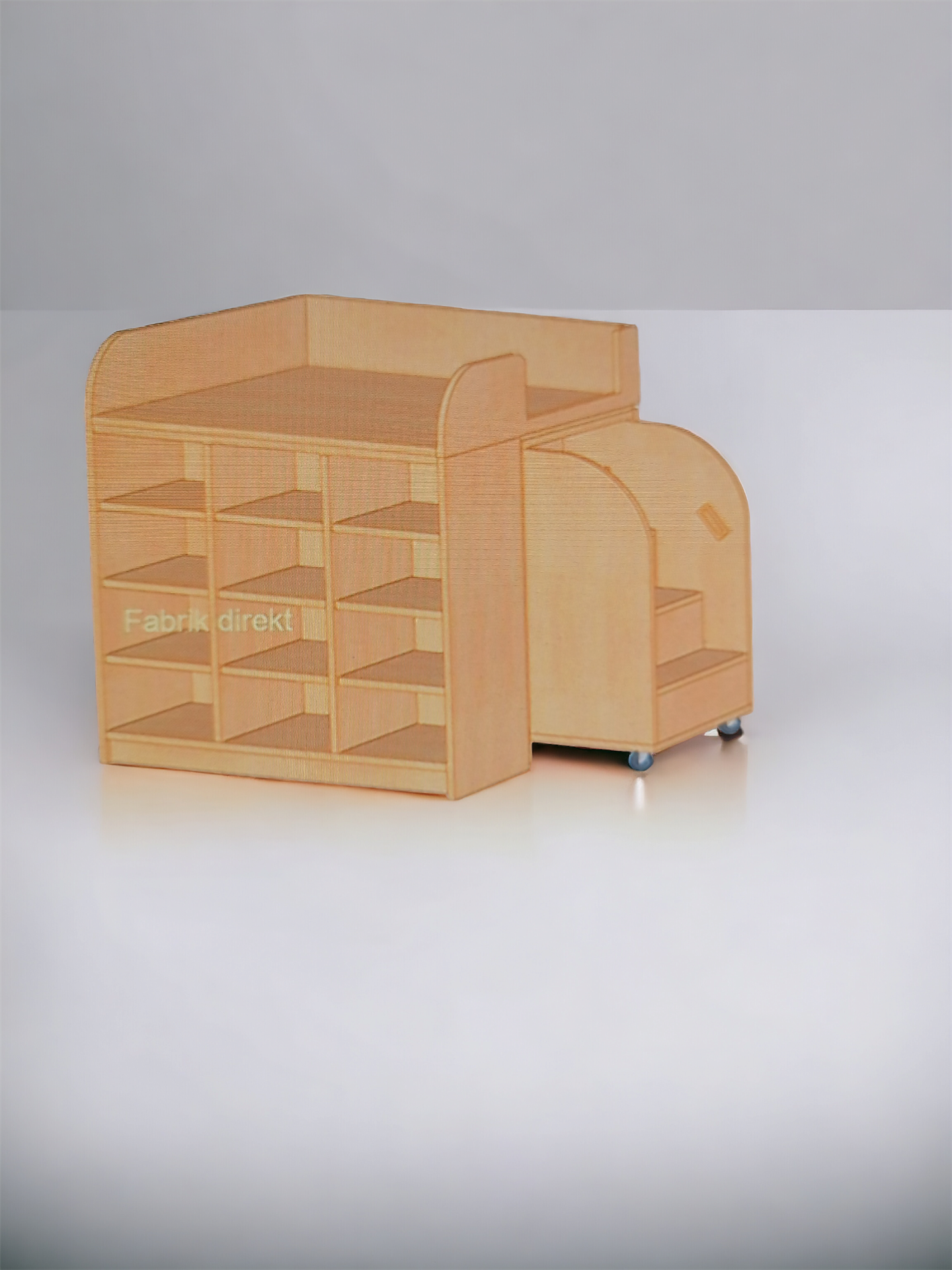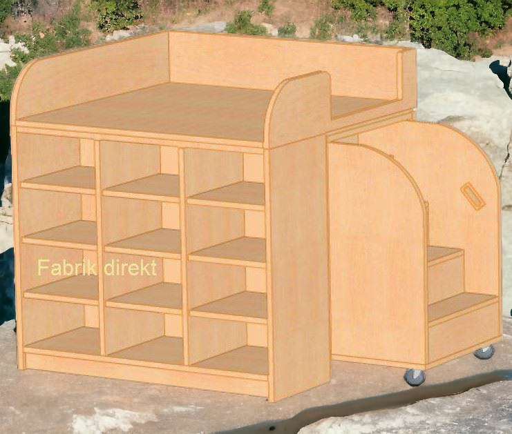 Diese Wickelkommode "Quadrat 12" von Fabrik direkt ist mit einer 10cm zurückgesetzten Sockelblende ausgestattet. Dieser "technische Kniff" erleichtert die körperlich schwere Arbeit (Waschen, Windeln, Heben etc. der Kinder) der Erzieherinnen an der Wickelkommode sehr.
