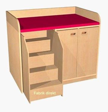 Die Wickelkommode WK 10 L ist mit ausziehbarer Treppe auf Rollen links versehen und hat rechts einen Schrank mit Doppeltür, dahinter befinden sich 2 praktische Einlegeböden.