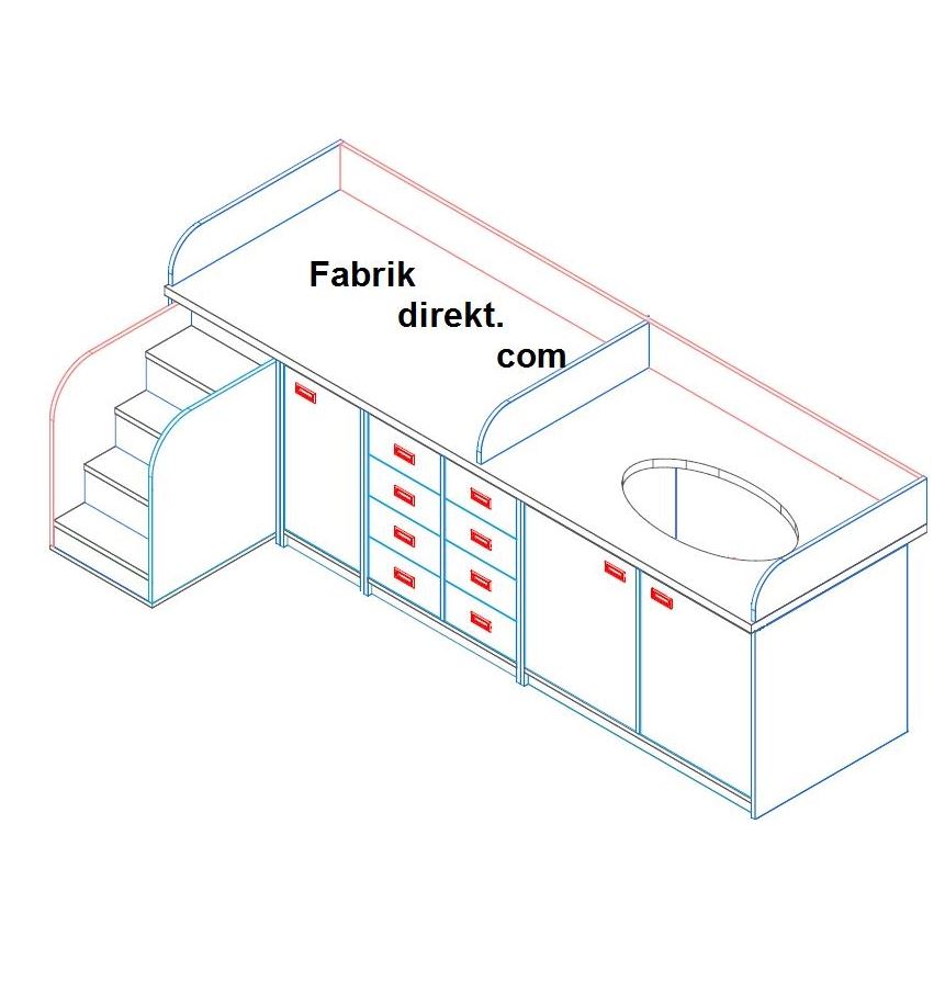 Unter der Wanne befinden sich 2 Flügeltüren, über dem Schrank mit Tür (innen 1 Einlegeboden), der ausziehbaren Treppe mit Verriegelung und den 8 Schubkästen ist eine durchgängige Wickelfläche von B x T 1560 x 73cm bzw. bei 90-er Tiefe 1560 x 88cm.