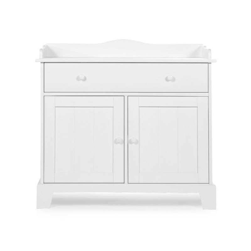 Wunderschöne Wickelkommode/Kommode im Design Country Snow White aus massivem Kiefernholz, mit 1 Schublade und 2 Türen. Die Wickelauflage lässt sich später abnehmen.