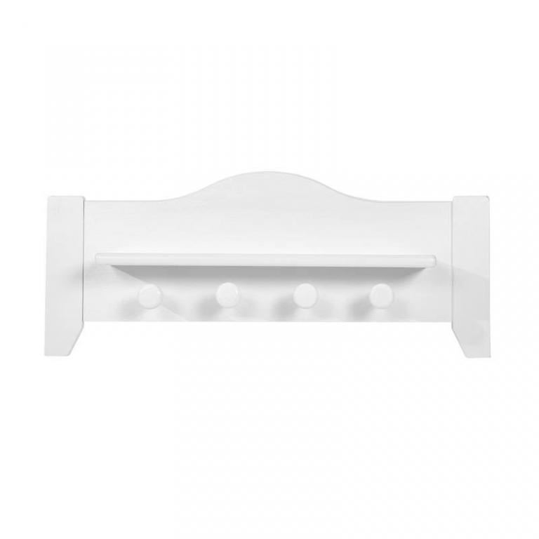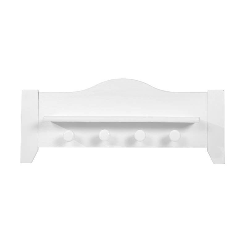 Wunderschönes Wandregal im Design Country Snow White aus massivem Kiefernholz, mit 1 Ablage und 4 Kleiderhaken.