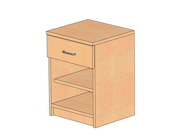 Praktisches und solides Nachtischschränkchen aus deutscher Meisterwerkstatt im Standarddekor Buche. Dieses tolle Möbelstück wurde für Hotelerie, Jugendherbergen, Altenheime und natürlich auch für unsere verehrte Privatkundschaft entworfen und ist in 2 verschiedenen Ausführungen erhältlich einmal in der klassischen Korpusbauweise (s. Abb.) und natürlich in der optisch-aufwertenden Stollenbauweise (Massivholzstollen, Standardausführung: Buche natur)