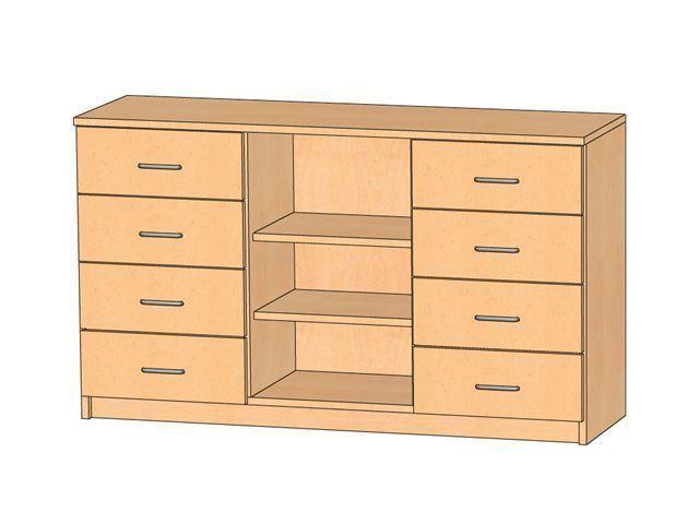 Praktisches und solides Sideboard, oder auch Anrichte genannt, aus deutscher Meisterwerkstatt im Standarddekor Buche mit chrom mattierten Segmentbogengriffen und aufschlagenden Türen. Dieses tolle Möbelstück wurde für Hotelerie, Jugendherbergen, Altenheime und natürlich auch für unsere verehrte Privatkundschaft entworfen und ist in 2 verschiedenen Ausführungen erhältlich einmal in der klassischen Korpusbauweise (s. Abb.) und natürlich in der optisch-aufwertenden Stollenbauweise (Massivholzstollen, Standardausführung: Buche natur)