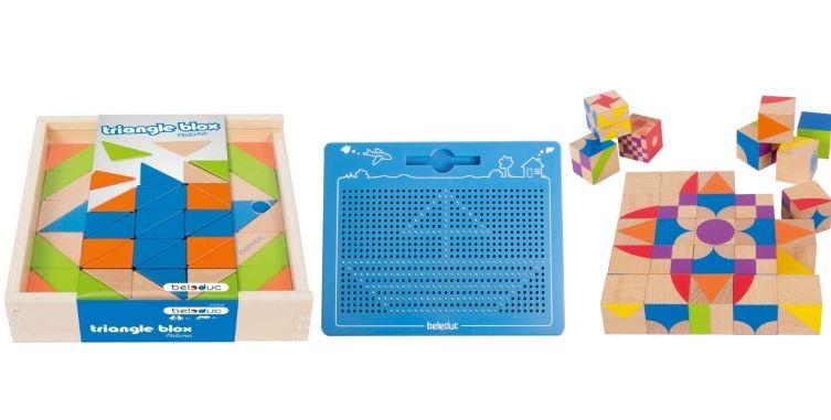 Dieses Kreativset besteht aus einer magnetischen Zeichentafel, dem "Moziblox Nature" und den "Triangle Blox".