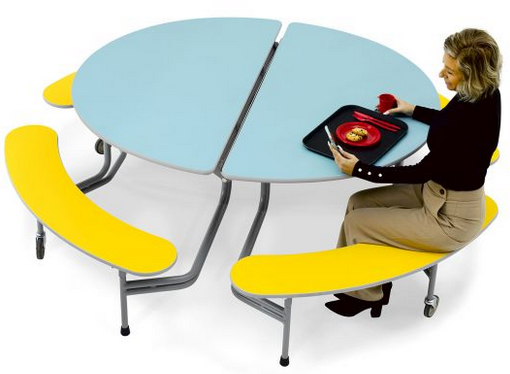 Die Stühle werden an den Tischen fest montiert - kein Stühlerücken, kein Kippeln und die Gänge bleiben stets frei.
