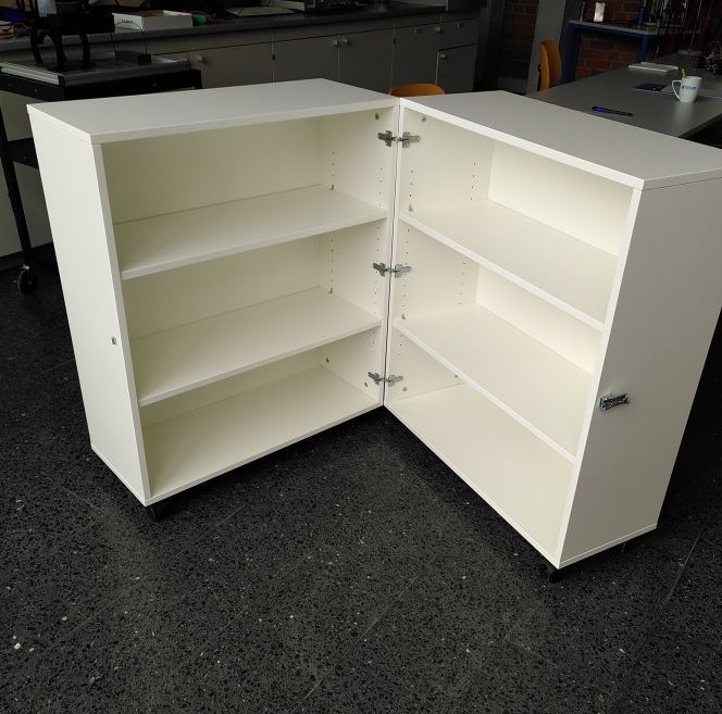 Unser super praktisches, leicht händelbares und fahrbares Doppel-Klappregal abschließbar mit einem Sicherheitsriegelschloss (s. unterhalb das Bild, Vorhängeschloss nicht im Lieferumfang), alle wichtigen Sachen in einem Regal vor neugierigen Blicken geschützt, mit 2x 2 verstellbaren Einlegeböden für viele Einsatzzwecke geeignet. Höhen zwischen den Böden ca. 27cm bei proportionaler Ausrichtung.