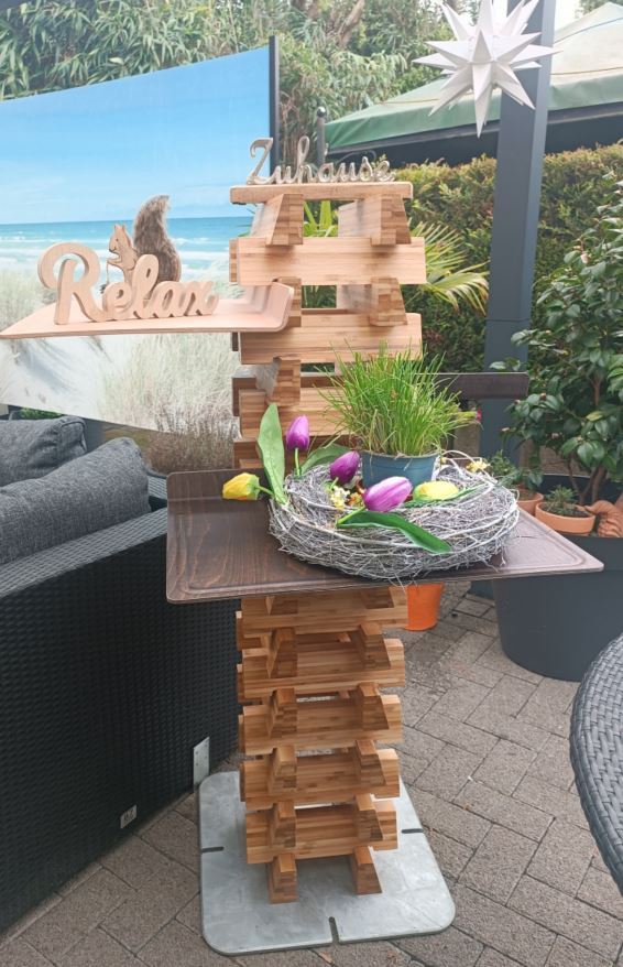 * Mehr Zeit für Gäste: Durch die zentrale Ablagefläche für Getränke und Snacks wird die Säule zum natürlichen Kommunikationsanker. Sie sind als Gastgeber mitten im Geschehen, während sich Ihre Freunde selbst bedienen. Sehr dienlich und hilfreich ist unsere Partysäule oder auch unser Stummer Diener, er gibt Gastgebern die Möglichkeit mehr Zeit mit Gästen zu verbringen und diese stets gut versorgt zu wissen, dekorativ und nachhaltig gefertigt aus Bambusblöcken.