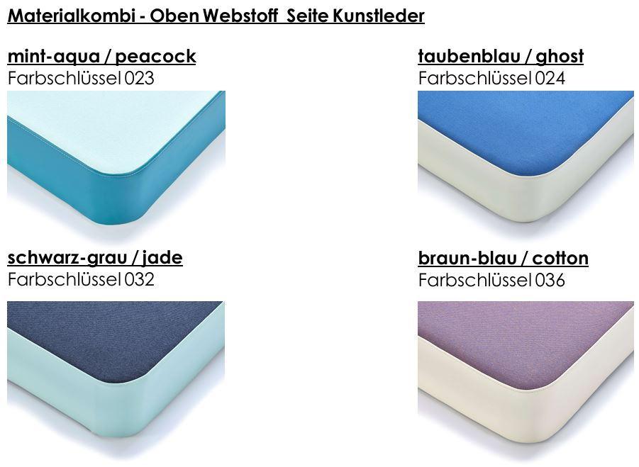 Die Oberseite ist ein absolut robuster Webstoff, die Seitenteile bestehen aus Kunstleder, wählen Sie bitte am Ende der Bestellung Ihre bevorzugte Variante! Wir bieten Ihnen 3 tolle Farbkombinationen an.