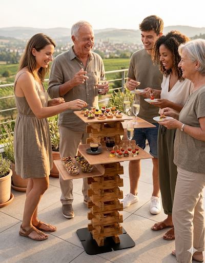 * Mehr Zeit für Gäste: Durch die zentrale Ablagefläche für Getränke und Snacks wird die Säule zum natürlichen Kommunikationsanker. Sie sind als Gastgeber mitten im Geschehen, während sich Ihre Freunde selbst bedienen. Sehr dienlich und hilfreich ist unsere Partysäule oder auch unser Stummer Diener, er gibt Gastgebern die Möglichkeit mehr Zeit mit Gästen zu verbringen und diese stets gut versorgt zu wissen, dekorativ und nachhaltig gefertigt aus Bambusblöcken.