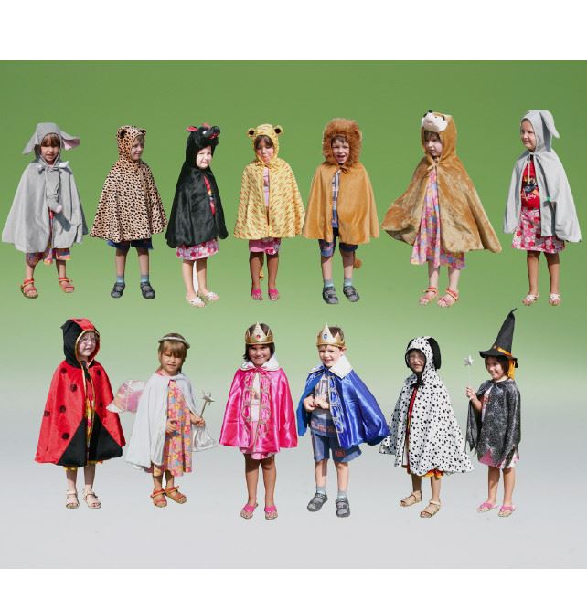 Die Verkleidungskiste beinhaltet 13 unterschiedliche Kostüme, Bär, Dalmatiner, Elefant, Marienkäfer, Tiger, Wolf, Leopard, Hase, Zauberer (Hexe), Engel, Löwe, König und Königin.